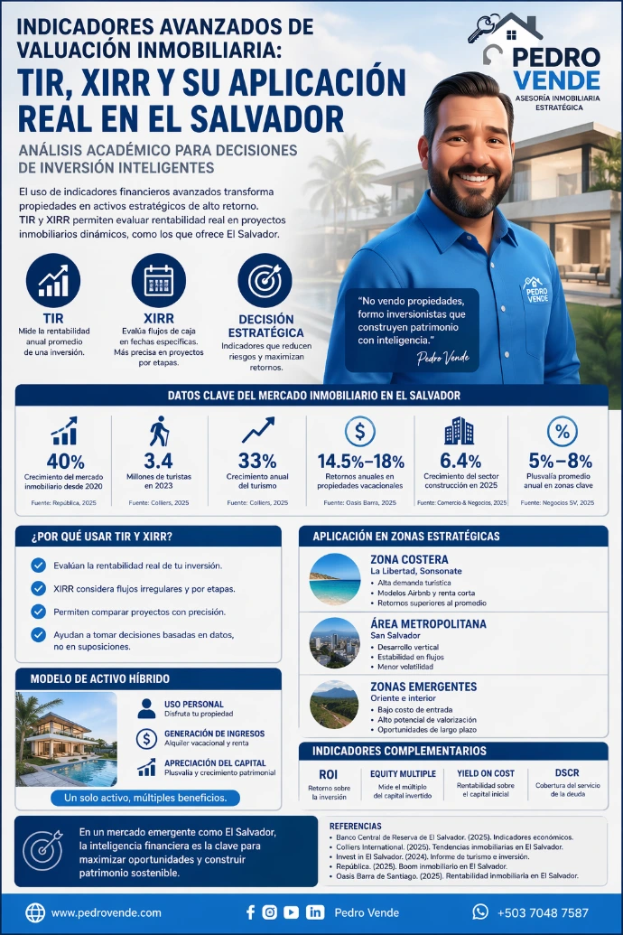 La XIRR corrige las limitaciones de la TIR al considerar fechas específicas de inversión y retorno. Este enfoque es esencial en El Salvador, donde los flujos dependen de preventas, fases constructivas y estacionalidad turística.